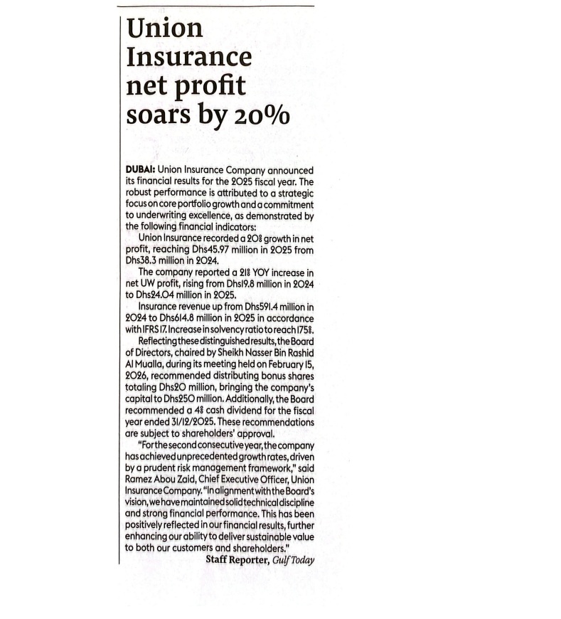 Board of Directors Recommends AED20 million in bonus shares and 4% cash dividendsUnion Insurance Company, one of the leading providers of innovative c…